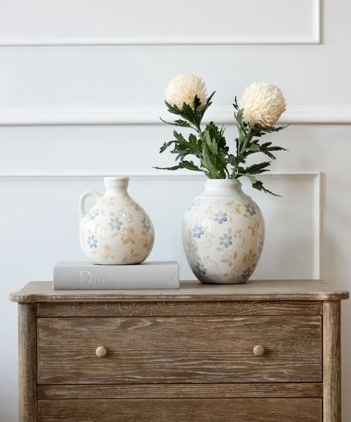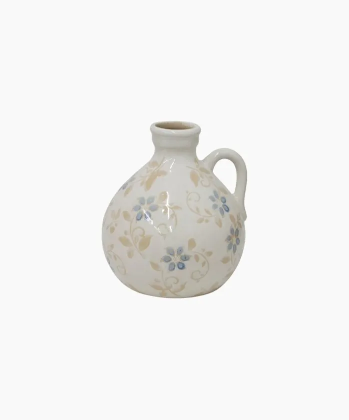 - Style Description:Sweet ceramic jug adorned with petite blue flowers. Perfect for holding foraged flowers.