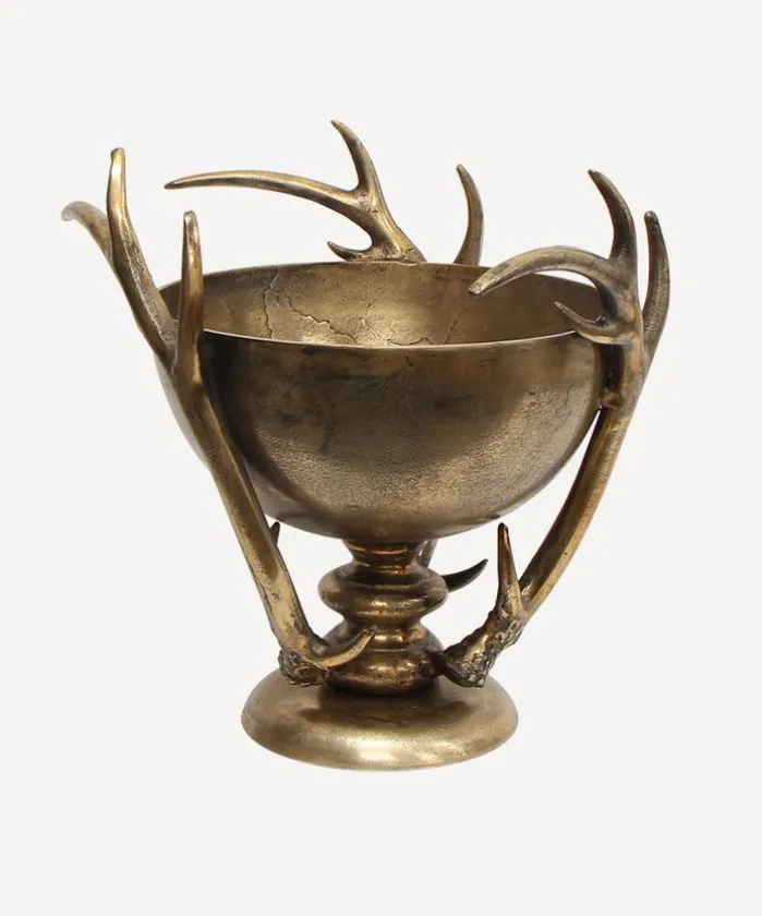 - Style Description:A golden toned display bowl with sculptural antler handles.