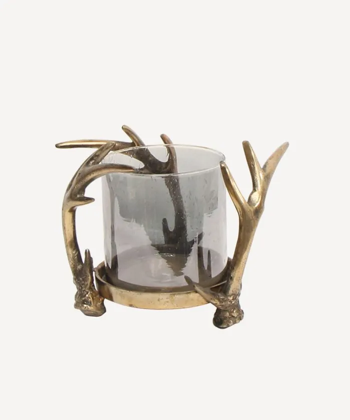 - Style Description:The antler motif gets a new life in this glass and brass effect hurricane lantern.
