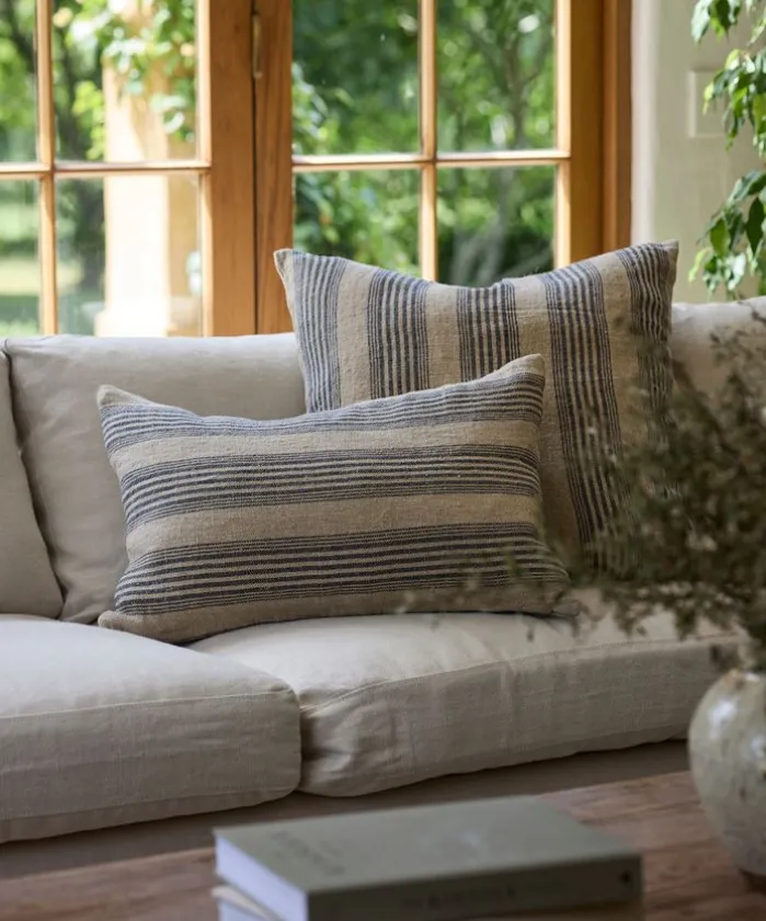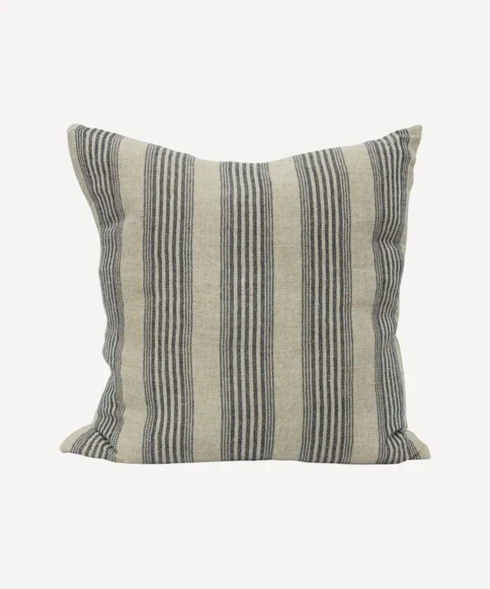 - Style Description:Heavy linen textured multi stripe navy cushion.