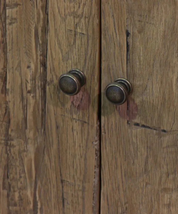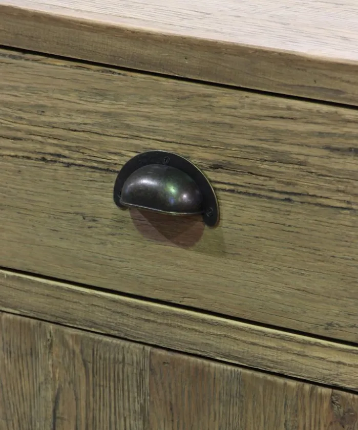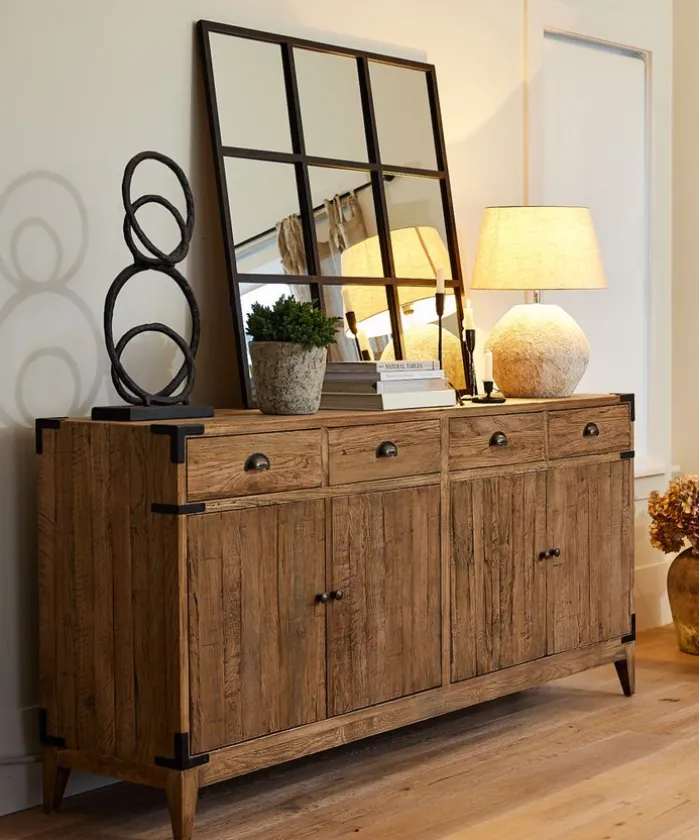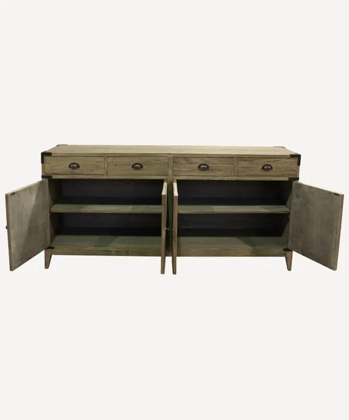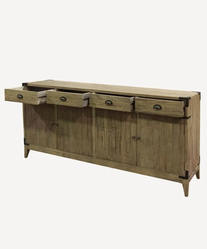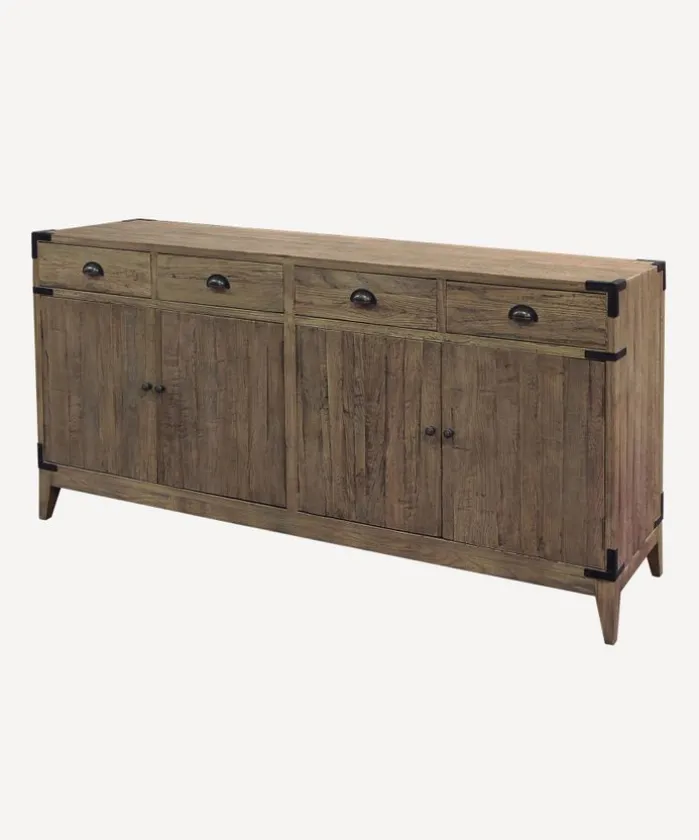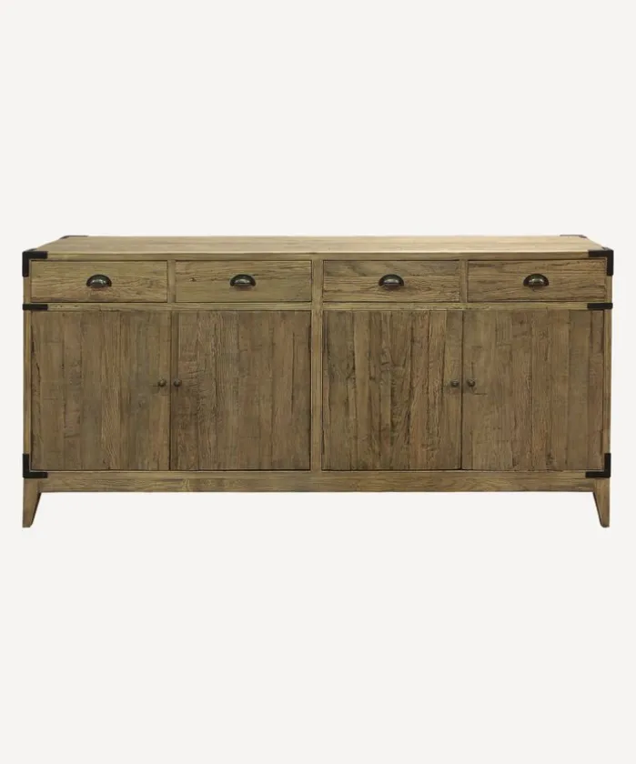 - Style Description:Functional sideboard featuring 4 drawers and 4 cupboards with 2 shelves. Made from reclaimed oak with metal handles and detailing. A great addition to the living room, kitchen or hallway.