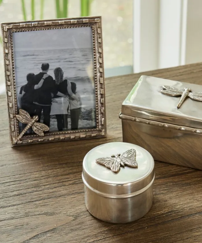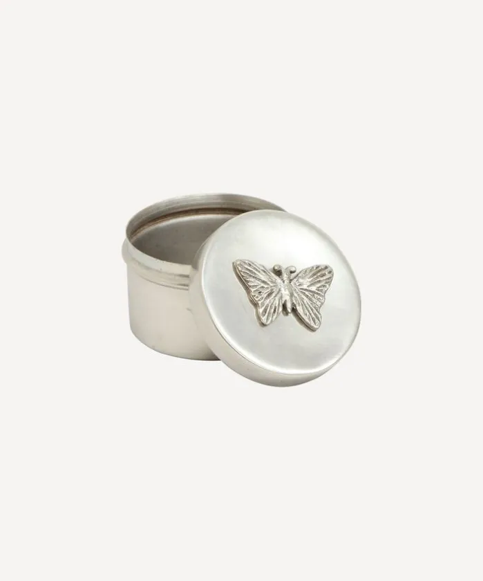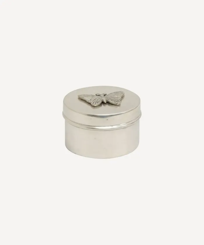 - Style Description:Silver metal cannister with butterfly motif and bamboo design. Place jewellery or treasured trinkets inside.