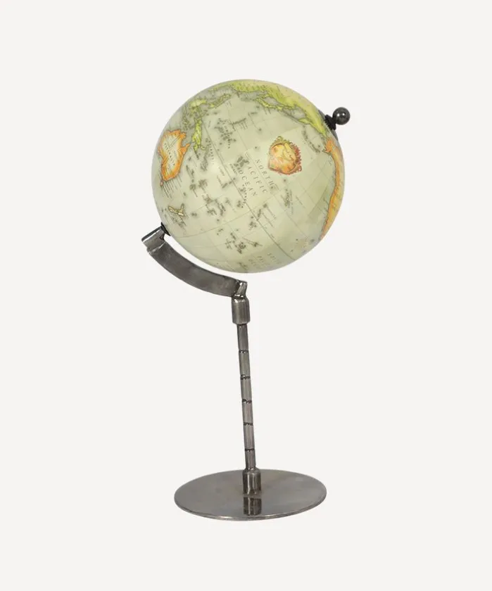 - Style Description:Enrich your home and study the world with one of French Country’s favourite decorating pieces. Sea green 8 inch globe that rotates on a grey nickel iron stand.