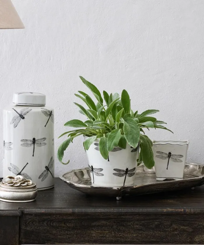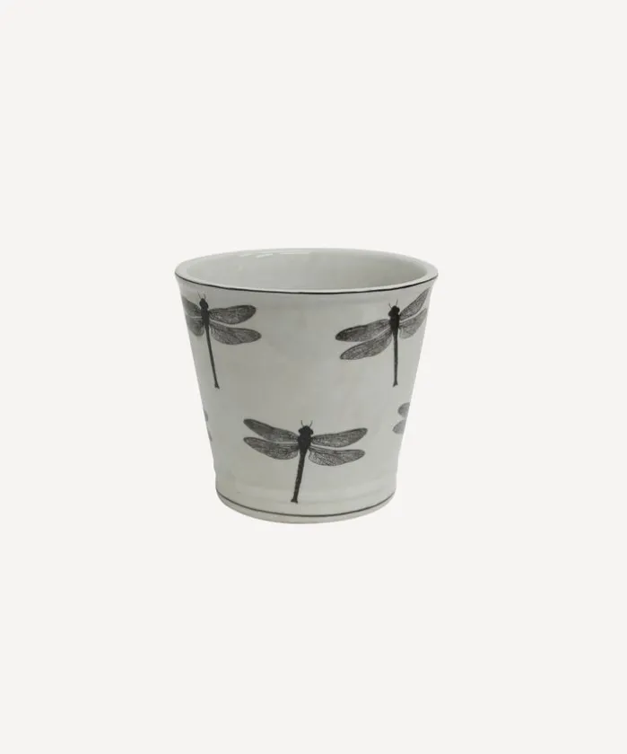 - Style Description:This stylish round pot holder is adorned with black and white dragonflies, perfect for indoor and outdoor use.