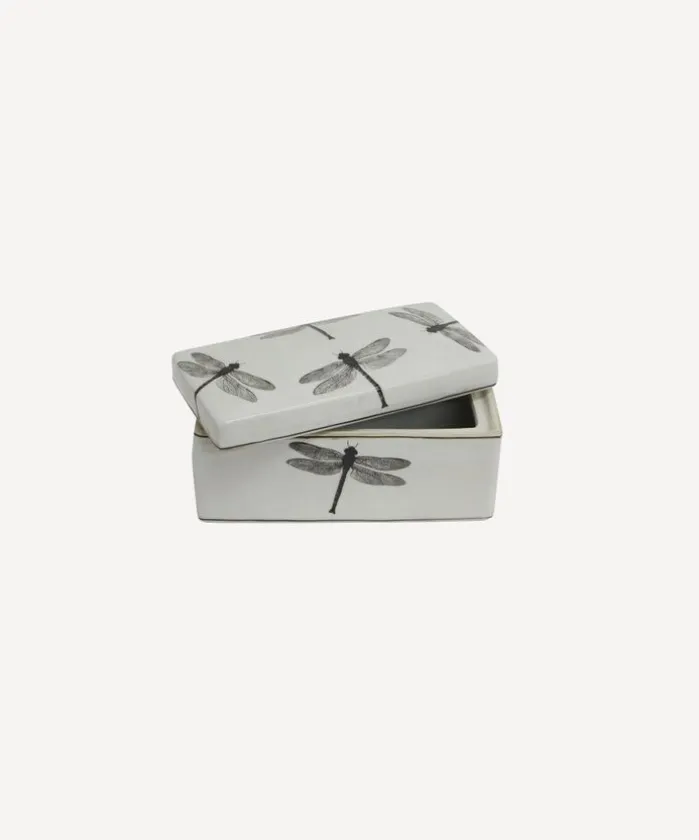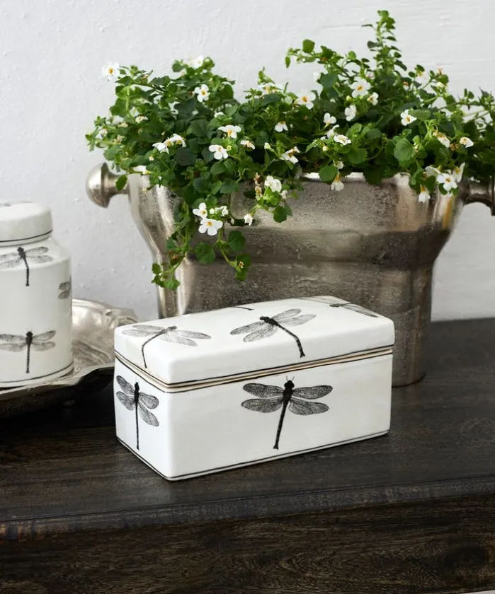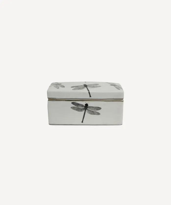 - Style Description:A stylish storage box for any part of the home, this rectangular porcelain dish features a charming black and white dragonfly decal.