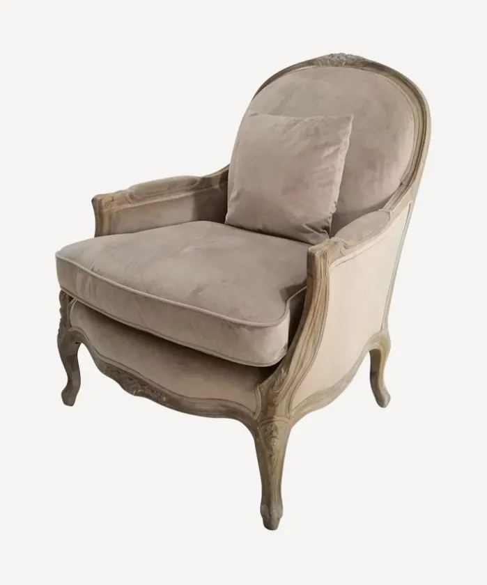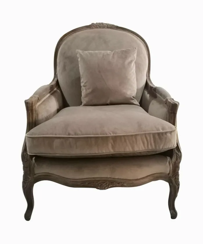 - Style Description:Natural antique designed chair with velvet lining and exposed wooden framing. This chair has the true character of French furnishings with its classically structured cabriole frame and round backing. This design goes beyond its time period, and would be beautifully styled in any kind of contemporary space.