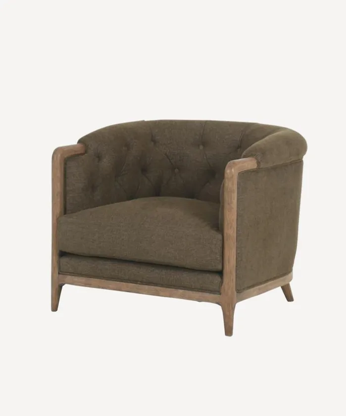 - Style Description:The Ellsworth Chair is versatile and perfect for both classic and contemporary living spaces. A traditional design featuring button tufting and classic rolled arms with exposed parawood framing for a natural touch.The seating inners are made of 40% foam, 30% fiber and 30% duck feather supported by sinuous springs for extra comfort and upholstered in a deep, earthy olive 100% polyester performance fabric for a warm regal look. Performance fabrics are specially created to withstand spills, stains, high traffic and wear, ensuring long-term comfort and unmatched durability. This fabric scored 25000 on the Martindale Test making it ideal for high levels of everyday use.