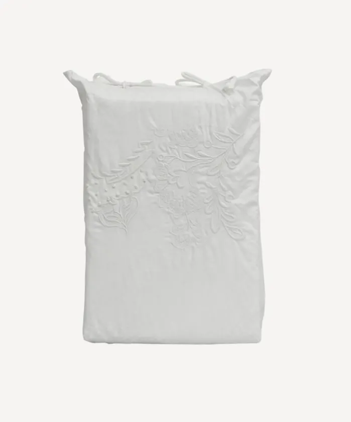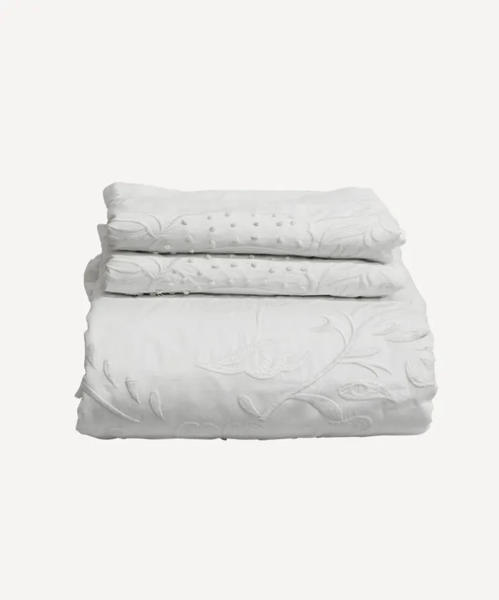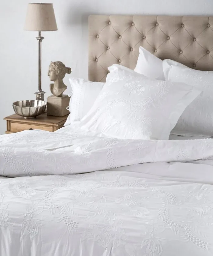- Style Description:This signature range of crisp, white cotton linen is beautifully embroidered with a detailed yet not fussy pattern. Available in duvets and euros and paired with the simpler dot design in sheets and pillowcases. Fitted sheets also available.