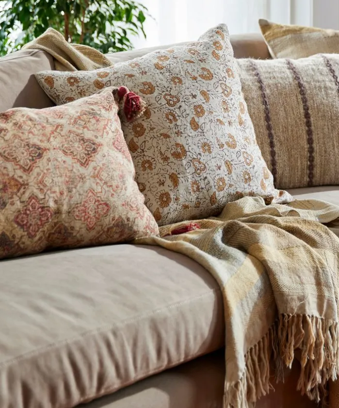 - Style Description:Warm antique tones, filagree printed cushion with tassles, layer up or mix and match for a relaxed eclectic style.
