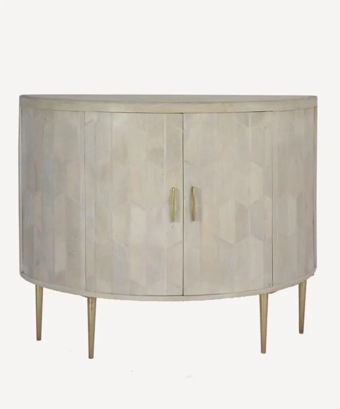 - Style Description:An elegant parquetry sideboard made from solid Mango wood in India, by a team of artisan furniture makers. Features exquisite parquetry detailing in whitewash with brass plated legs and handles. Perfect small to mid size piece for any area of the home.