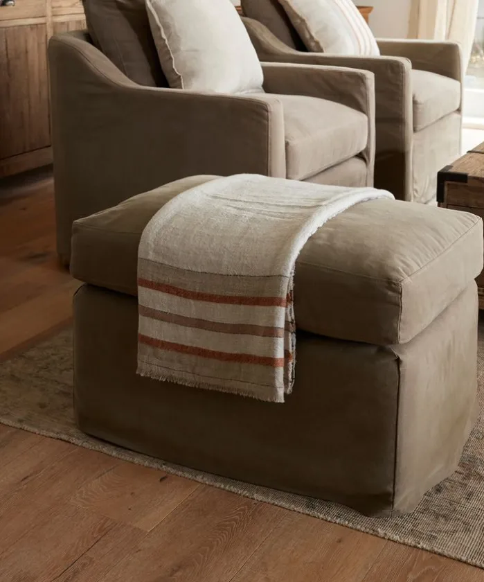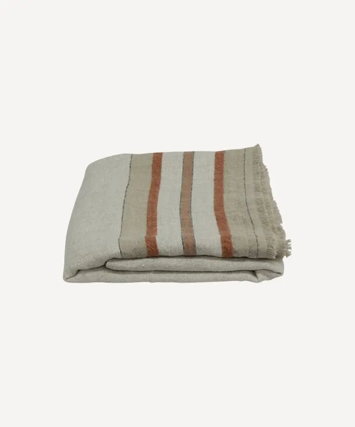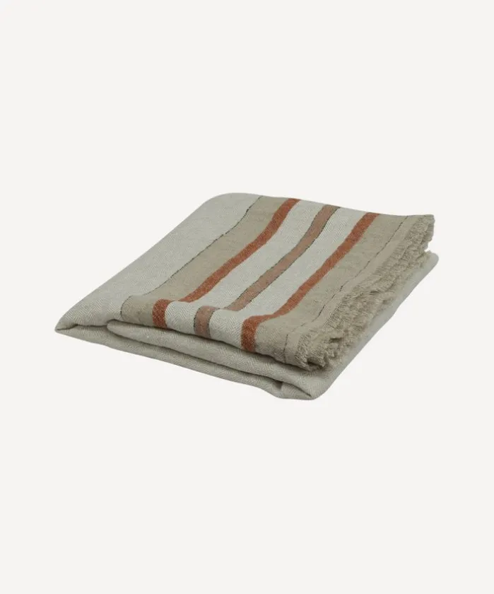 - Style Description:French Riviera inspired stripe throw in muted tones with frayed edges and a herringbone weave. Made from 100% heavy linen.