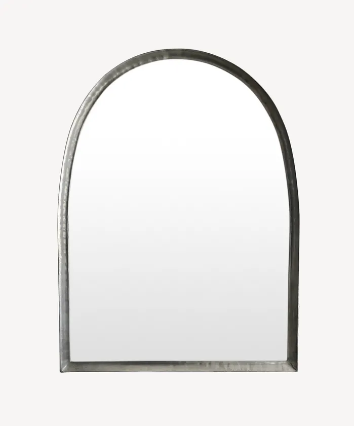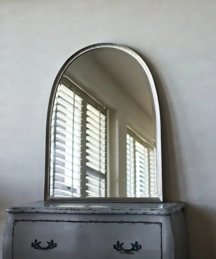 - Style Description:Versatile rounded top mirror, ideal for bedrooms and bathrooms, features a beaten silver metal frame.