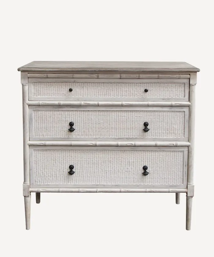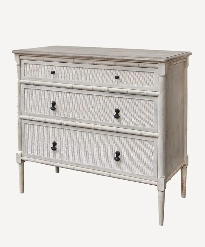 - Style Description:French designed chest of drawers in a classic colonial style. Features bamboo design legs and rattan facing. Painted in a soft antique white.