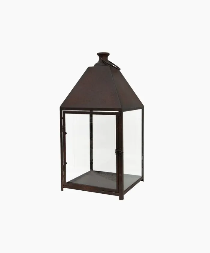 - Style Description:Square iron and glass lantern in rustic brown finish use with single or multiple pillar candles.