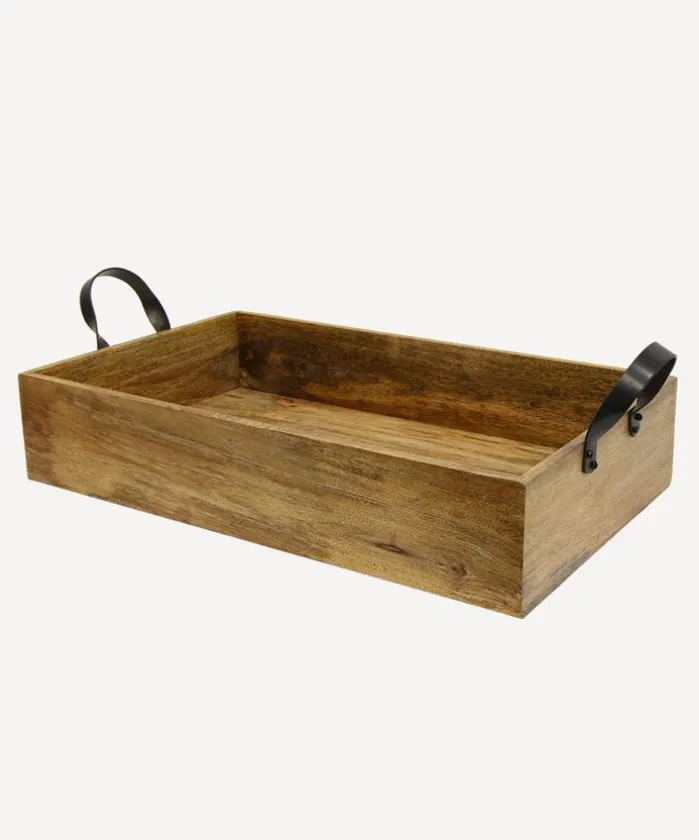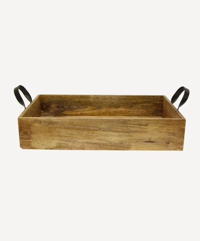 - Style Description:A generous rectangle tray with high sides and rustic iron handles.