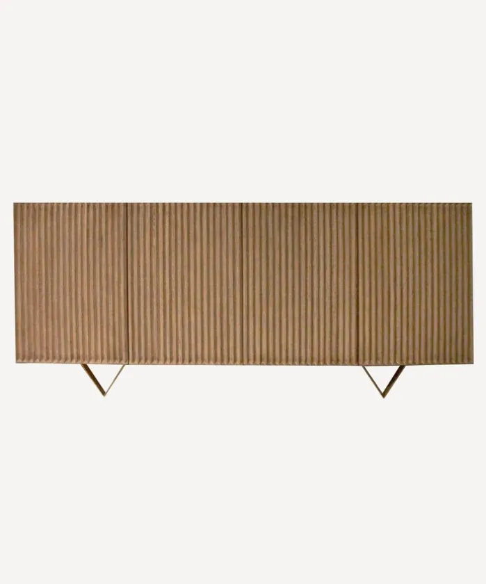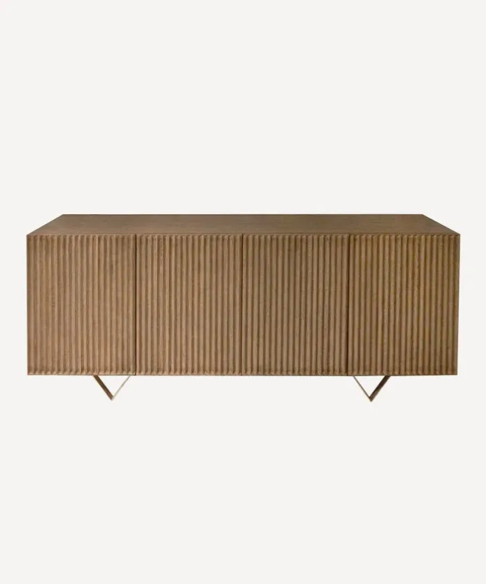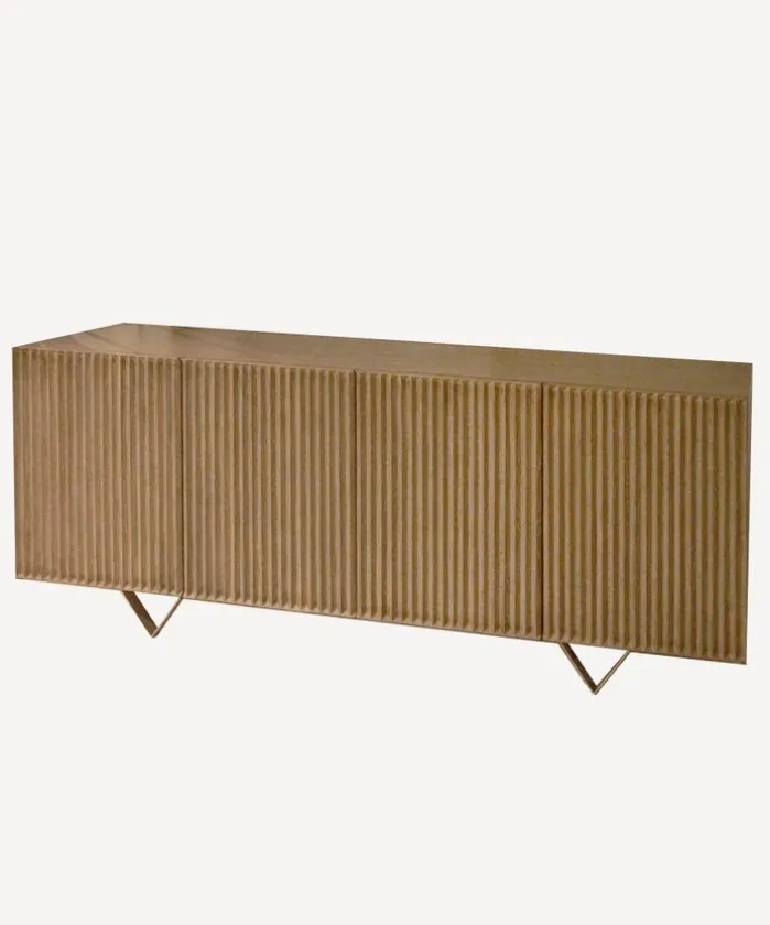 - Style Description:Modernistic sideboard made from a natural colour Oak veneer. Sideboard features four doors with ridged detailing and two internal shelves making it the perfect piece for storage.