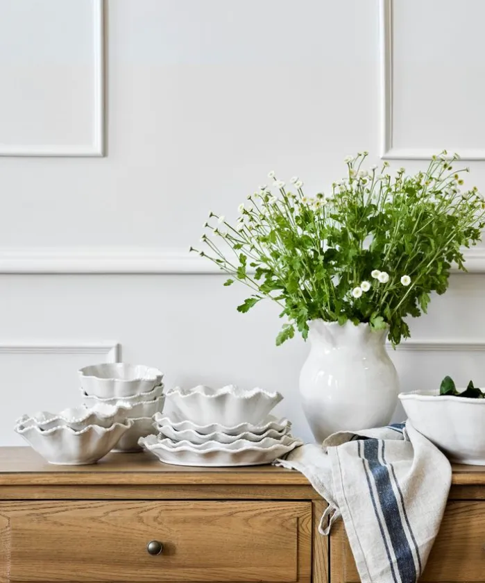 - Style Description:The Scilla dinnerware exudes a timeless elegance reminiscent of an Italian seaside heirloom. Each piece is hand-crafted with scalloped edges that add a touch of vintage charm and rope rim detail giving the dinnerware a distinct look that evokes the feeling of artisanal excellence passed down through generations.
