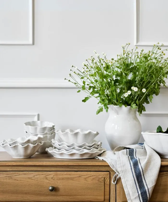 - Style Description:The Scilla dinnerware exudes a timeless elegance reminiscent of an Italian seaside heirloom. Each piece is hand-crafted with scalloped edges that add a touch of vintage charm and rope rim detail giving the dinnerware a distinct look that evokes the feeling of artisanal excellence passed down through generations.